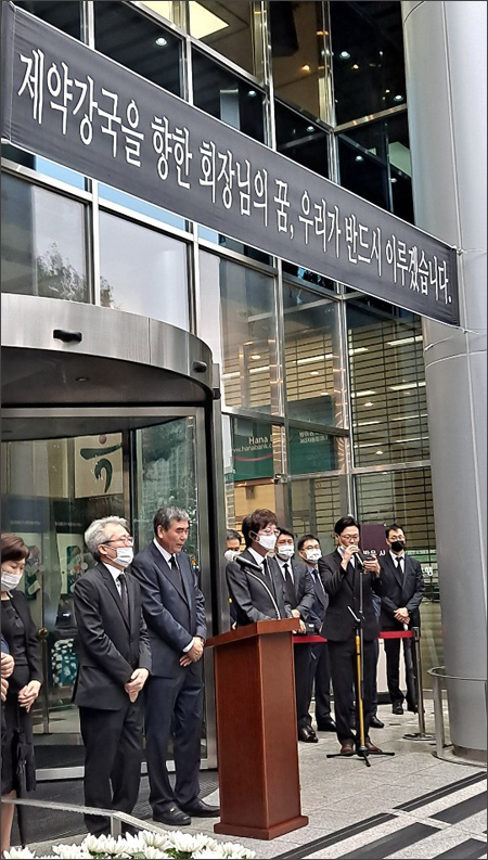 위기의 순간 마다 특유의 창조적 해법으로, 우리를 이끌어 주신 회장님을 이렇게 보내드려야 한다는 것도 도무지 믿기지 않습니다. 정말로 참담하고 애석한 심정을 억누를 길이 없습니다.