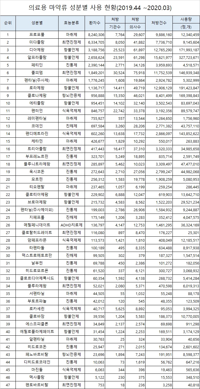 성분별로는 '디아제팜' 319만명, '알프라졸람' 266만명, '로라제팜' 114만명의 순서로 사용한 환자수가 많았다.