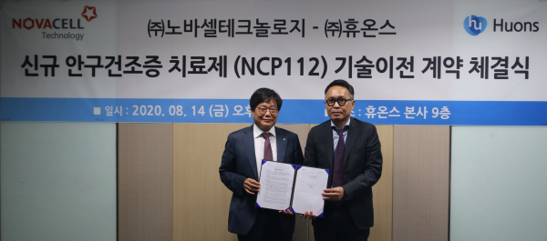 휴온스는 지난 14일 후보물질 'NCP112'의 안질환 치료 신약 개발 이전을 위한 기술이전 계약을 체결했다고 18일 밝혔다. 체결식에는 휴온스 성남 판교 본사 엄기안 대표와 이태훈 노바셀테크놀로지 대표가 참석했다.