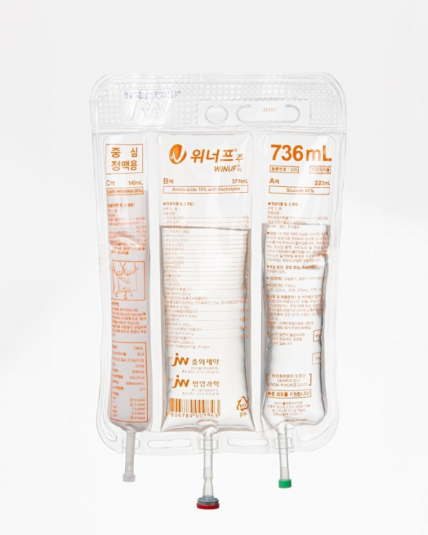 JW중외제약이 중심정맥용 소용량 종합영양수액제(TPN, Total Parenteral Nutrition) '위너프 736 ㎖'를 선보인다.