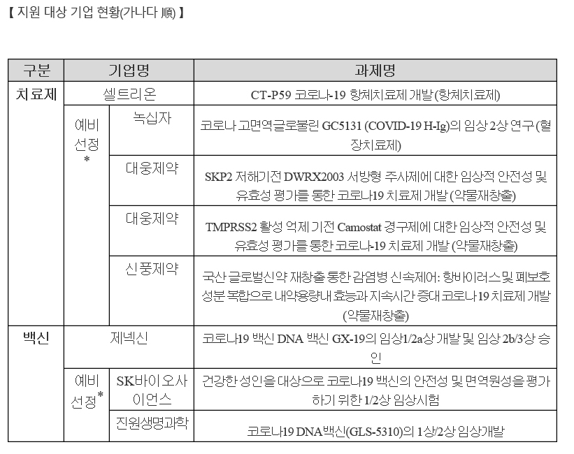 정부는 코로나19 치료제·백신 임상 시험 지원 대상으로 총 8개 과제(치료제 5개, 백신 3개)을 (예비)선정했다고 밝혔다.