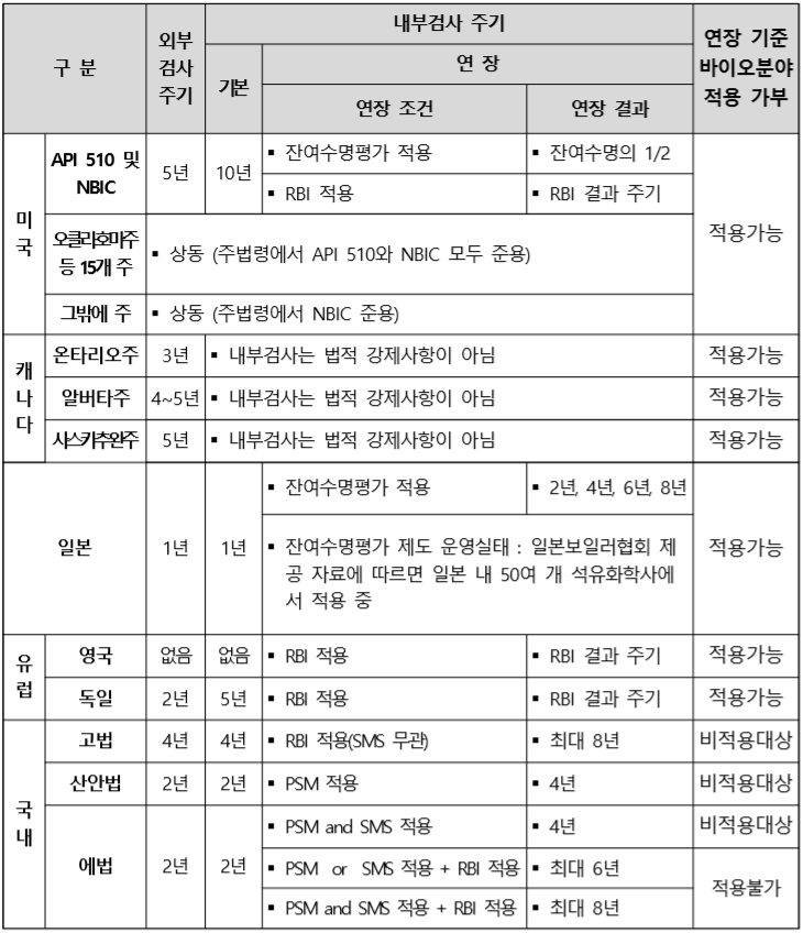 2) 국내에는 내부검사 위험성에 따른 연장 기준(최대 8년)이 있지만 바이오플랜트에 적용할 수 있는 기준은 없다.