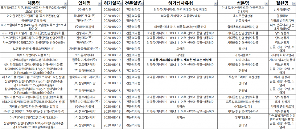 품목 신규 허가= 같은 기간 총 21품목이 허가받았다. 분류별로 ▲전문의약품 19품목 ▲일반의약품 2품목이다. 허가심사 유형에 따르면 ▲제네릭 11품목 ▲기타 5품목 ▲의약품 4품목 ▲자료제출의약품 1품목이다.