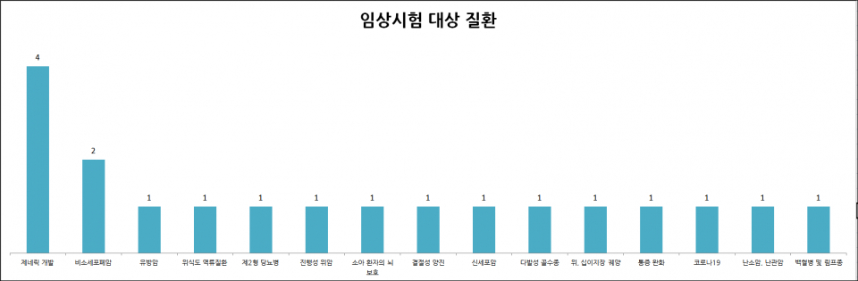 해당 임상시험이 대상으로 한 개발 및 질환은 ▲제네릭 개발 4건 ▲비소세포폐암 2건 ▲유방암 · 위식도역류질환 · 제 2형 당뇨병 · 진행성 위암 · 소아 환자의 뇌 보호 · 결절성 양진 · 신세포암 · 다발성 골수종 · 위, 십이지장 궤양 · 통증 완화 · 코로나19 · 난소암, 난관암 · 백혈병 및 림프종 각 1건이었다.
