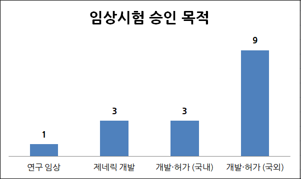 시험단계 상 ▲3상 5건 ▲1상 4건 ▲생동성(생물학적 동등성) 3건 ▲1/2상, 2상, 2a상 각 1건 순이다. 승인 목적에 따르면 ▲국외 약물 개발·허가 9건 ▲국내 약물 개발·허가, 제네릭 개발(생물학적동등성) 각 3건 ▲연구목적 임상 1건 순이다.