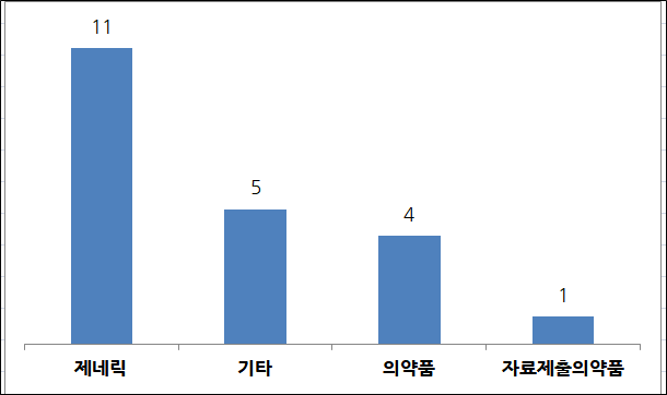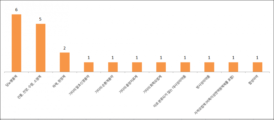 질환군에 따라 ▲당뇨병용제 6품목 ▲진통, 진양, 수렴, 소염제 5품목 ▲하제, 완장제 2품목 ▲기타의 말초신경용약 · 기타의 순환계용약 · 기타의 종양치료제 · 기타의 화학요법제 · 따로 분류되지 않는 대사성의약품 · 방사성의약품 · 자격요법제(비특이성면역원제제를 포함) · 합성마약 등 각 1품목 순이었다.