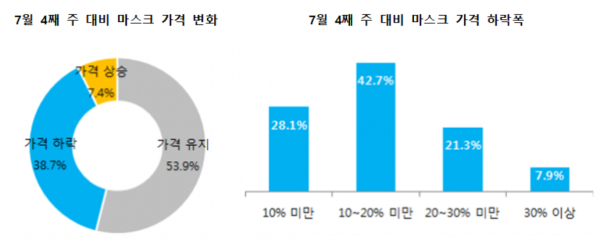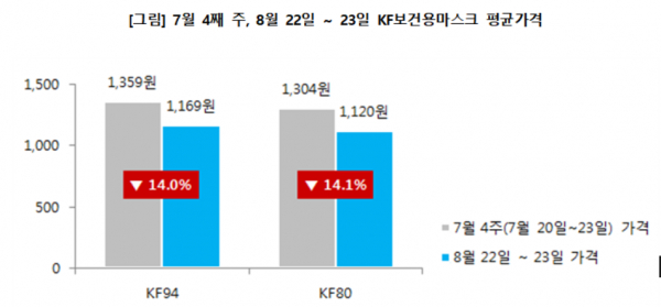 22일~23일 KF94의 온라인쇼핑몰 평균 가격은 1169원으로 7월 넷째주 1,359원과 비교해 14%(190원) 하락했다. 또한 KF80의 경우에도 온라인쇼핑몰 평균 가격은 1120원으로 7월 넷째 주 1304원 보다 14.1%(184원) 하락했다.