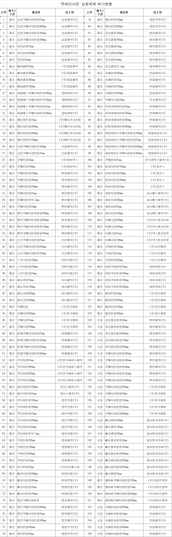 식품의약품안전처는 '쿠에티아핀' 성분 제제의 미국 식품의약품청(FDA) 안전성 정보와 관련해 국내·외 허가 현황, 제출의견 등을 종합 검토한 결과에 따라 9월 10일자로 35개사 156품목에 대한 허가사항 변경지시를 내렸다고 밝혔다.