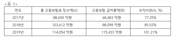 총 고용보험 기여액은 2019년 기준 11조4054억원, 총 급여액는 11조5433억원으로 101.21%를 넘는 급여율을 보였다.