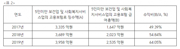 반면, 같은 기준으로 5인 미만 보건업 및 사회복지서비스업 종사자의 기여액은 3958억원인데 반해 급여액은 2535억원으로 64.05%에 지나지 않았다.