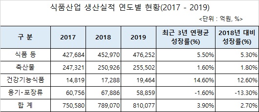 식품의약품안전처는 2019년 국내 식품산업 생산실적은 81조 77억으로 2018년 78조 9070억 대비 2.7% 증가했고, 건강기능식품은 13.6%의 높은 연 평균 성장률을 기록했다고 27일 밝혔다.