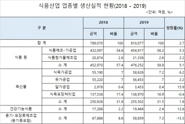 '식품 등' 생산실적은 47조 6252억로 2018년 45조 2970억 대비 5.1% 증가했고, 전체 국내식품 생산실적의 58.8%를 차지했다.