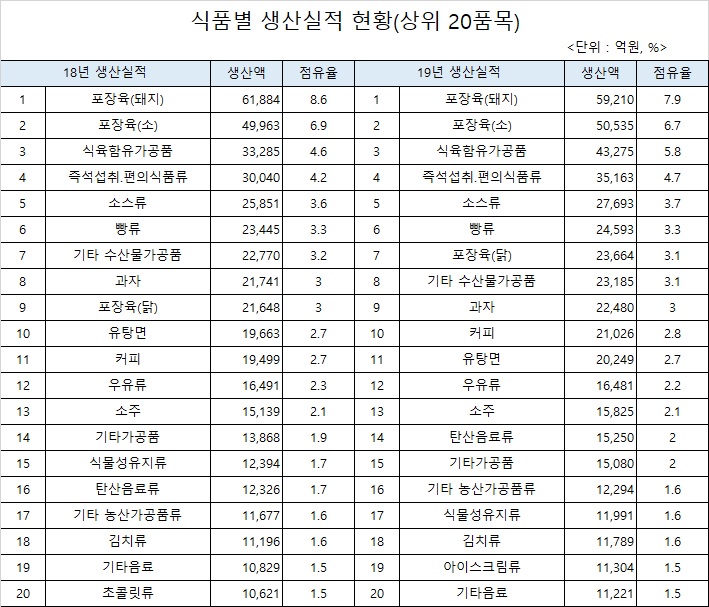 2019년 식품산업 생산실적 81조 77억…전년비 2.7% 증가, 저출산으로 우유류 감소세 이어저