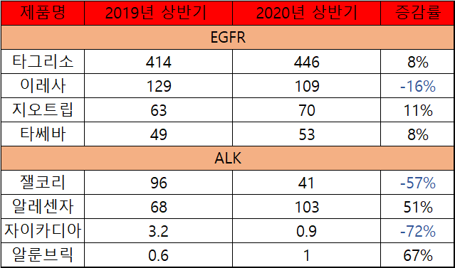 시장조사데이터 유비스트에 따르면, EGFR 억제제 시장에서 아스트라제네카의 타그리소(오시머티닙)의 상반기 원외처방액은 446억원으로 전년도 같은기간 보다 8% 성장했다. 로슈의 알레센자(알렉티닙)는 ALK 억제제 시장에서 103억원을 기록하며, 전년도 같은기간 보다 51% 성장했다.
