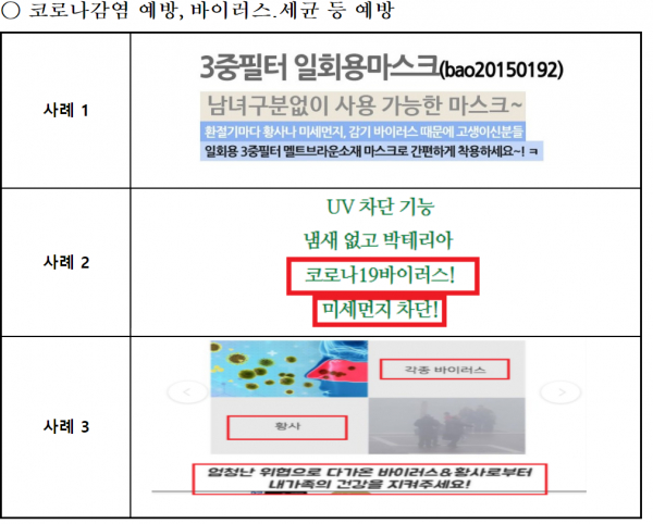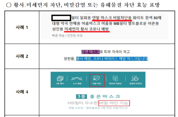 식품의약품안전처와 한국소비자원은 총 3740건을 점검해 허위·과대광고 446건을 적발했다. 전부 '의약외품'이 아닌 '공산품 마스크'를 '황사·미세먼지 차단', '비말차단, 유해물질 차단', 의약외품(KF 마스크)', '코로나19 감염 예방', '바이러스·세균 예방' 등을 표방해 의약외품으로 오인할 우려가 있거나 의학적 효능이 있는 것으로 허위광고한 사례였다.