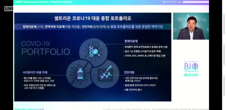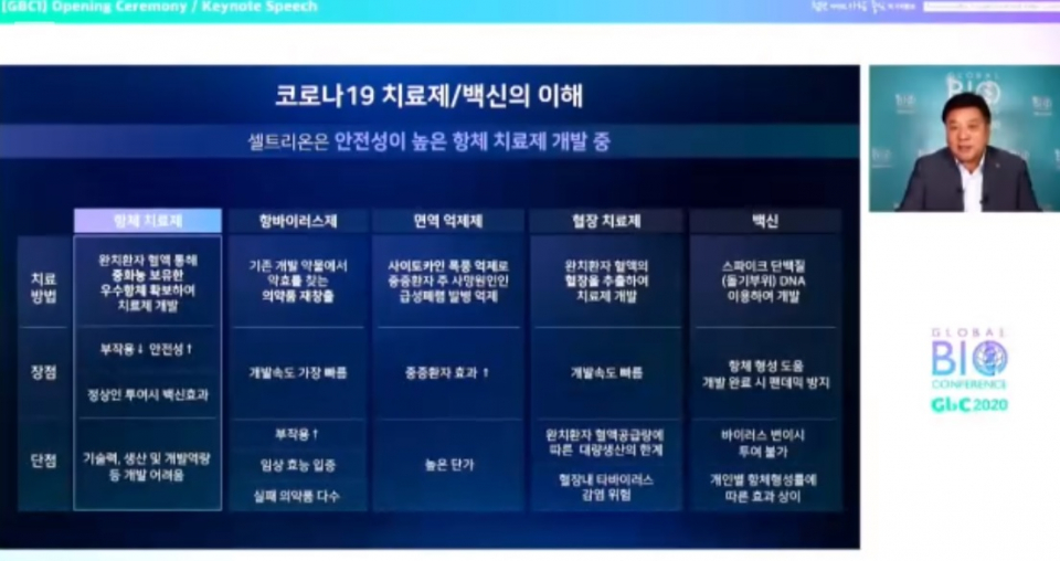 현재 셀트리온은 코로나19를 치료할 항체치료제 CT-P59를 개발 중인데, 이와 관련해 서 회장은 초기 치료의 중요성을 강조하며 "원숭이에게 치료제를 투입하니 24시간 안에 바이러스 소멸 결과를 확인했다"고 말했다.