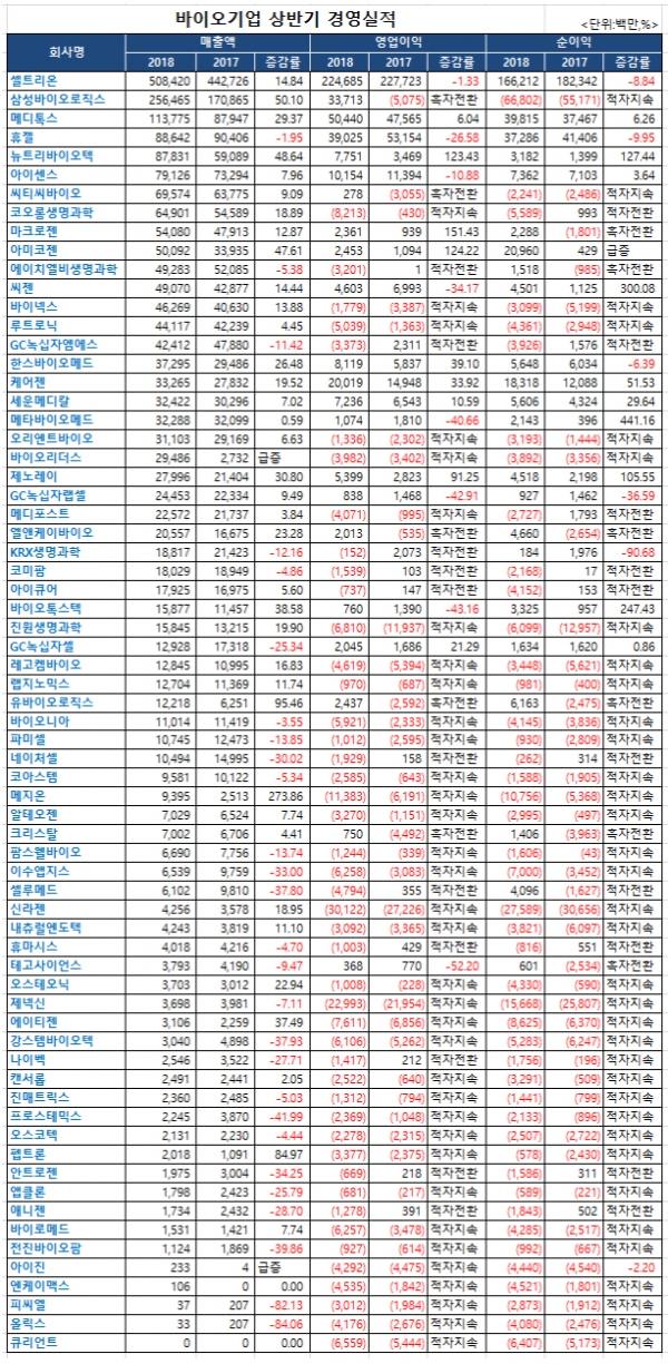대부분 바이오기업들의 실적이 부진한 가운데서도 삼성바이오로직스, 마크로젠, 아미코젠, 케어젠, 뉴트리바이오텍, 제노레이, 엘엔케이바이오, 크리스탈이 주목을 받았다.