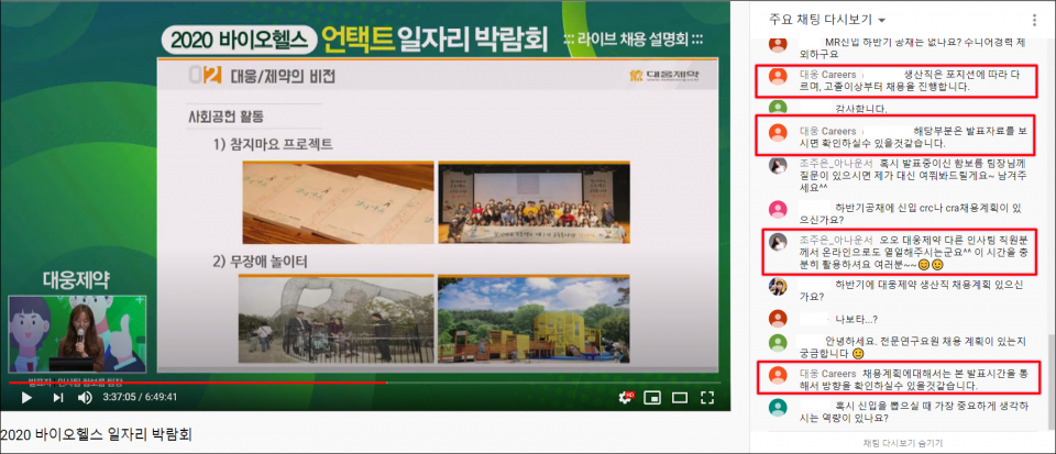 현직자는 구직자가 궁금해 할 직무를 설명, 답변하는 ▲직무 토크쇼 ▲취업아카데미가 마련됐다. 36개사의 현직자는 사전에 구직자들의 신청을 받아 1:1 직무 상담과 컨설팅도 한다. 유튜브 채팅창에 올라오는 질문에 현직자나 인사 담당자가 실시간 답변해주자 구직자들은 만족과 고마움을 표현했다.