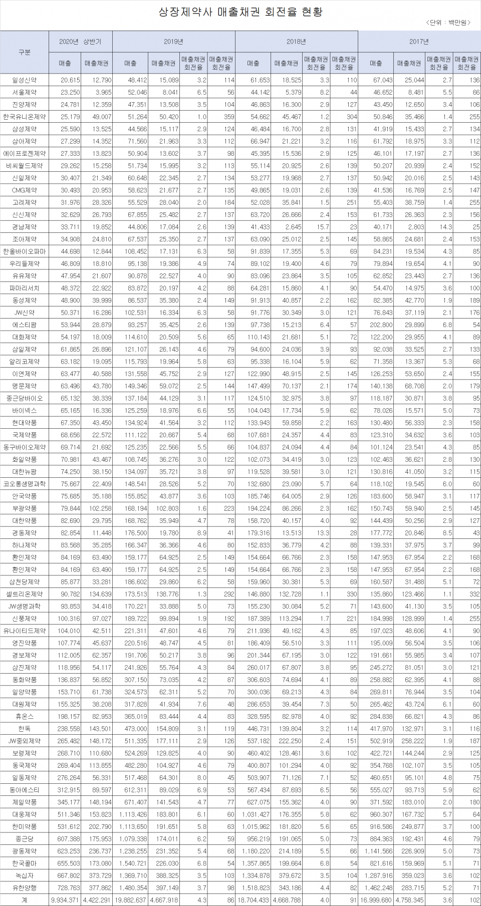 이와는 달리 한국유니온제약은 매출채권 회전일이 359일로 가장 길었고, 그 뒤는 셀트리온제약 292일, 부광약품 223일 등 200일이 넘는 곳이 3개사였다.