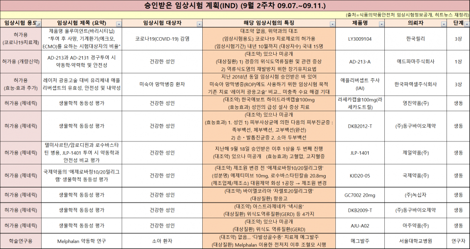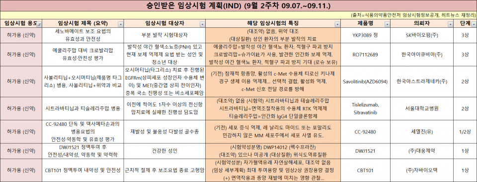 한 눈에 보는 임상 승인·품목 허가 - 9월 2주차 (09.07.~09.11.)