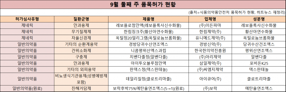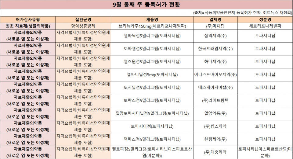 9월 2주차 21품목이 새로 허가받았다. 식약처의 허가심사유형에 따르면 ▲생물의약품 1품목 ▲자료제출의약품(새로운 염 또는 이성체) 10품목 ▲제네릭 3품목 ▲일반의약품 7품목이다. 소아 희귀질환인 '바텐병' 치료제가 국내 첫 허가받았다.
