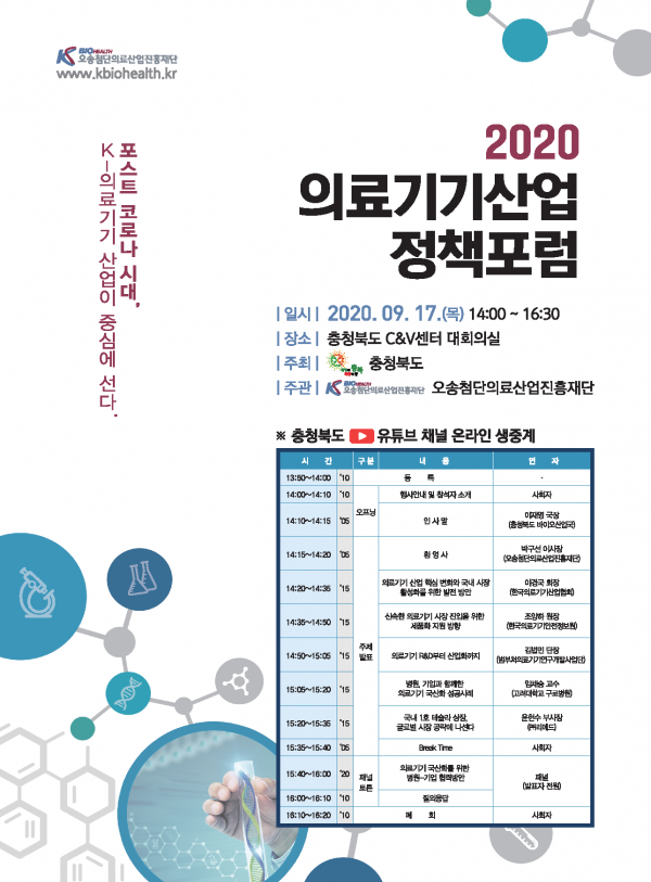 충청북도와 오송첨단의료산업진흥재단 첨단의료기기개발지원센터는 오는 17일 오후 2시 충청북도 C&V센터 대회의실에서 '2020 의료기기산업 정책포럼'을 개최한다고 14일 밝혔다.