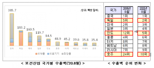 국가별 보건산업 수출 순위는 중국(3.9억 달러, 14.4%), 독일(1.8억 달러, +198.0%), 미국(1.6억 달러, +8.2%), 일본(1.2억 달러, +19.3%) 등 순으로 나타났다.