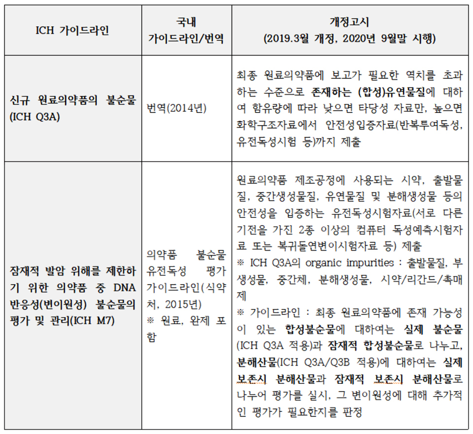 이 규제는 위 표에서 보는 바와 같이 ICH 가이드라인(M7)을 "의약품 불순물 유전독성 평가 가이드라인"(식약처, 2015년)으로 제정하였다가 이번 개정고시에 위 내용으로 규정되었다.