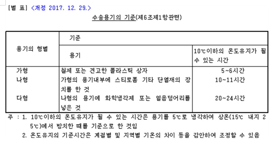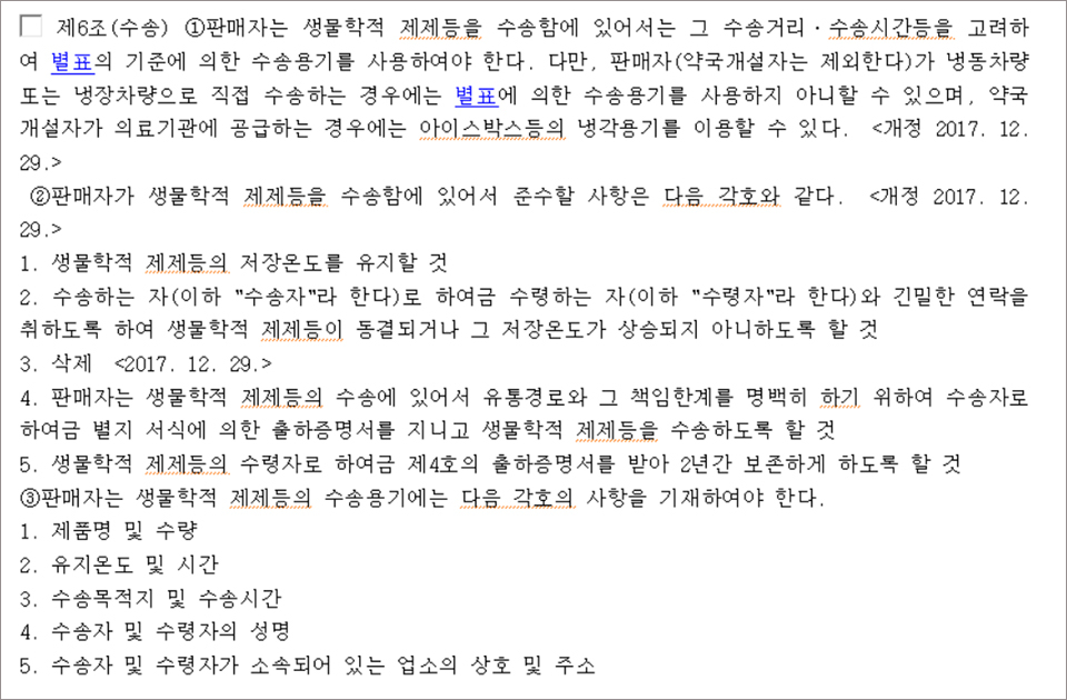생물학적제제규칙 제6조(수송)제2항제1호는 ▷'생물학적제제등의 저장온도를 유지할 것'으로 돼 있고 ▷의약품안전규칙 제62조제7호 관련 [별표6] '의약품 유통품질 관리규정(속칭, KGSP)' 제7호마목2는, '보관온도의 구분이 필요한 의약품은 운송 중에 적정한 온도를 유지하여야 한다'로 규정돼 있다.