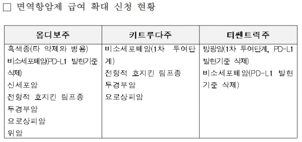 구체적으로 옵디보주의 경우 흑색종(타 약제와 병용), 비소세포폐암(PD-L1 발현기준 삭제), 신세포암, 전형적 호지킨림프종, 두경부암, 요로상피암, 위암 등이다.