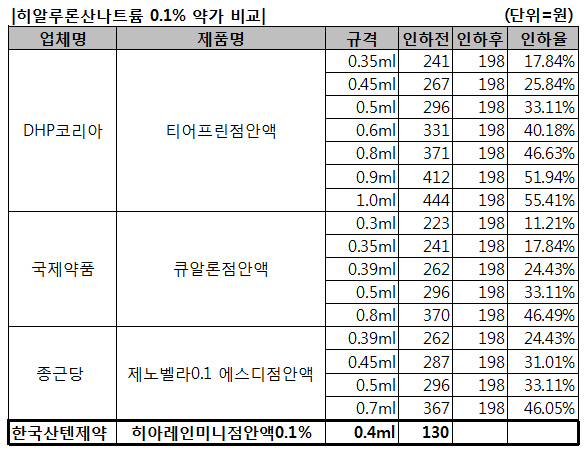 대표적 인공눈물 성분인 히알루론산나트륨 0.1%의 경우 이 기준에 맞춰 모두 198원으로 일괄 조정됐다. 그런데 업체들은 히알루론산나트륨 0.1% 중 기준 규격인 0.3~0.5ml 제품의 가중평균가를 구할 때 포함된 산텐제약의 히아레인미니점안액0.1%의 약tks가가 지나치게 낮아 가중평균가 자체를 왜곡시켰다고 주장한다.