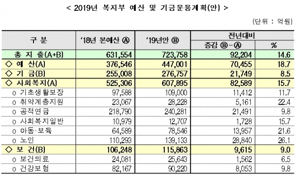 보건복지부(장관 박능후)는 사람 중심의 포용적 복지국가 구현을 위한 2019년 부 예산(안)을 올해보다 14.6% 증가한 72조3758억원으로 편성했다고 28일 밝혔다. 정부 전체 예산안 470조5000억원의 14.6%를 차지한다.