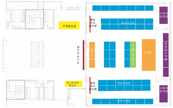 박람회장(B1 그랜드홀)입구에는 채용부스, 취업컨설팅, 멘토링 뿐만아니라 제약·바이오산업의 현주소와 역량을 한 눈에 볼 수 있는 산업홍보관도 내방객들의 눈길을 끌 전망이다. 일명 ‘미래를 여는 제약·바이오산업’으로 명명된 산업홍보관으로, 해당 공간에서는 제약·바이오산업의 경쟁력과 일자리 창출 역량이 담긴 부착물을 비롯해 산업홍보영상, 각 기업체들의 홍보 및 CF영상 등 약 50여편의 영상물을 상영해 산업에 대한 정보와 재미를 동시에 제공한다. 아울러, 특성화대학 홍보관에는 연세대학교·이화여자대학교·성균관대학교가 들어서 예비 취업자들을 불러 모을 예정이다.