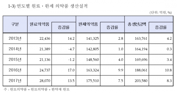 의약품 가운데 완제의약품 생산실적은 2017년 17조5510억원으로 전년(16조3324억원) 대비 7.5% 증가한 반면, 원료의약품은 2조8070억원으로 전년(2조4737억원) 대비 13.5% 증가했다. 이는 국내 바이오시밀러 제조업체들의 해외 수출이 늘어나면서 원료의약품 생산량도 증가한데 따른 것이다.