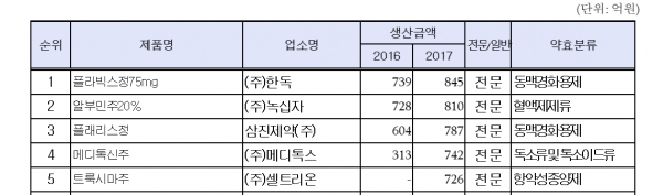 완제의약품의 경우 동맥경화치료제인 한독의 플라빅스정75mg (845억원)가 지난해 2위에서 1위로 올라섰으며, 그 뒤로 녹십자 알부민주20%(810억원), 삼진제약 플래리스정(787억원) 등 순이었다. 특히, 메디톡스의 메디톡신주(742억원) 생산이 전년 대비 136.9% 증가하여 4위를 기록했으며, 셀트리온의 트룩시마주(726억원)는 5위로 새롭게 진입했다.