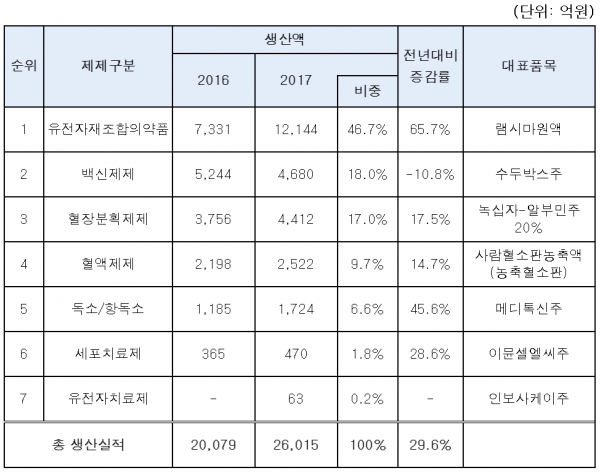 바이오의약품 품목별 생산실적은 램시마원액이 3671억원을 생산해 1위를 차지했으며, 트룩시마원액(3473억원), 허쥬마원액(968억원), 녹십자-알부민주 20%(810억원), 메디톡신주(743억원), 트룩시마주(726억원)가 뒤를 이었다.