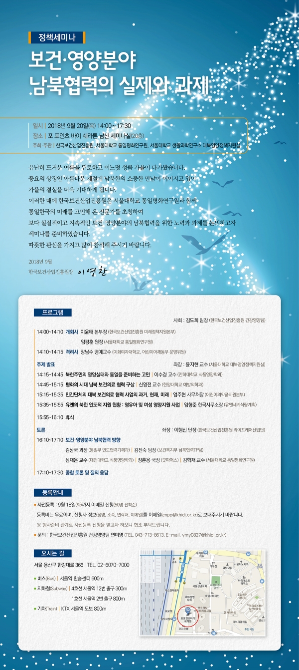 보건·영양분야 남북협력을 주제로 전문가의 발표와 실질적이고 지속적인 협력을 위한 노력과 전망에 대해 정부, 민간, 학계 등 함께 토론하는 정책세미나가 열린다.