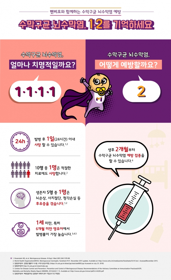 국내 수막구균 뇌수막염 환자의 10명 중 7명은 영유아 및 청소년이다. 특히, 면역체계가 미성숙한 1세 미만 영유아에서 가장 많이 발생하는데, 그 중에서도 6개월 미만의 영유아에서의 발병률이 높다. 수막구균 뇌수막염은 백신 접종으로, 예방할 수 있으며 생후 2개월 이상부터 접종이 가능하다.