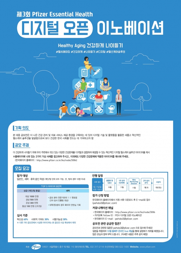 한국화이자제약(대표이사 사장 오동욱)이 '제 3회 화이자 에센셜 헬스(Pfizer Essential Health, 이하 PEH) 디지털 오픈 이노베이션' 공모전을 개최한다.