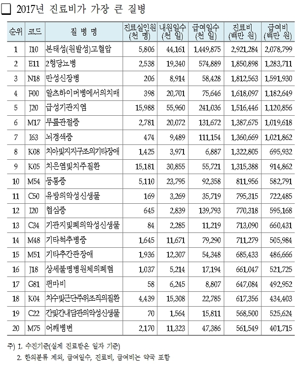 27일 통계연보를 보면, 2017년 진료비가 가장 큰 질병은 581만명이 2조9213억원을 쓴 '본태성(원발성) 고혈압'이었다. 이어 2형당뇨병 1조8509억원, 만성신장병 1조8126억원, 알츠하이머병에서의 치매 1조6180억원, 급성기관지염 1조5164억원 순으로 뒤를 이었다.