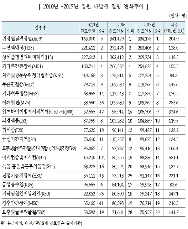 같은 해 입원진료가 가장 많았던 지령은 '위장 및 결장염'으로 33만4157명이 병원을 찾았다. 다음은 노년백내장(28만3406명), 폐렴(26만9734명) 순이었다.