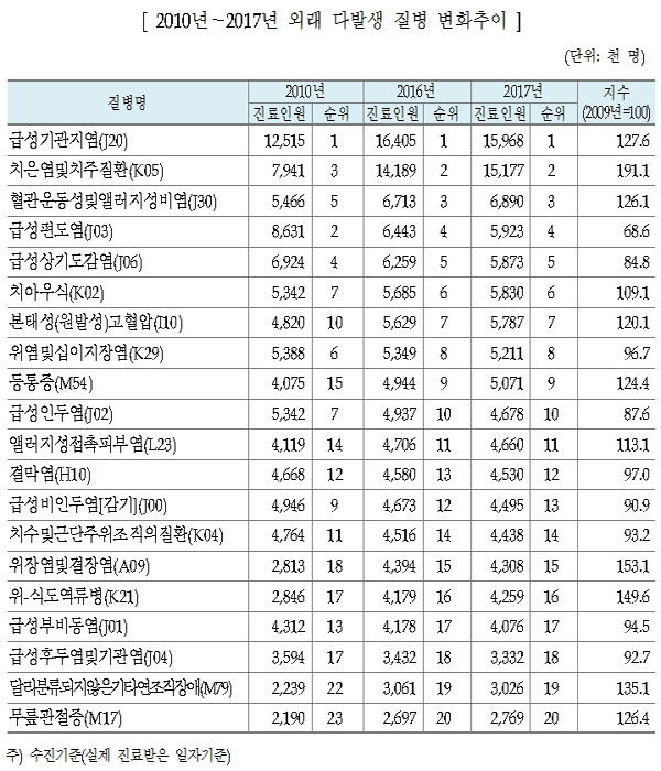 2010년 대비 다발생 순위가 상승한 질병은 ▲치은염 및 치주질환(K05): 794만명(3위)→1,518만 명(2위) ▲본태성 고혈압(I10): 482만 명(10위)→579만명(7위) ▲등통증(M54): 2010년 408만명(15위)→507만명(9위) ▲앨러지성접촉피부염(L23): 412만명(14위)→466만명(11위) 등이었다.