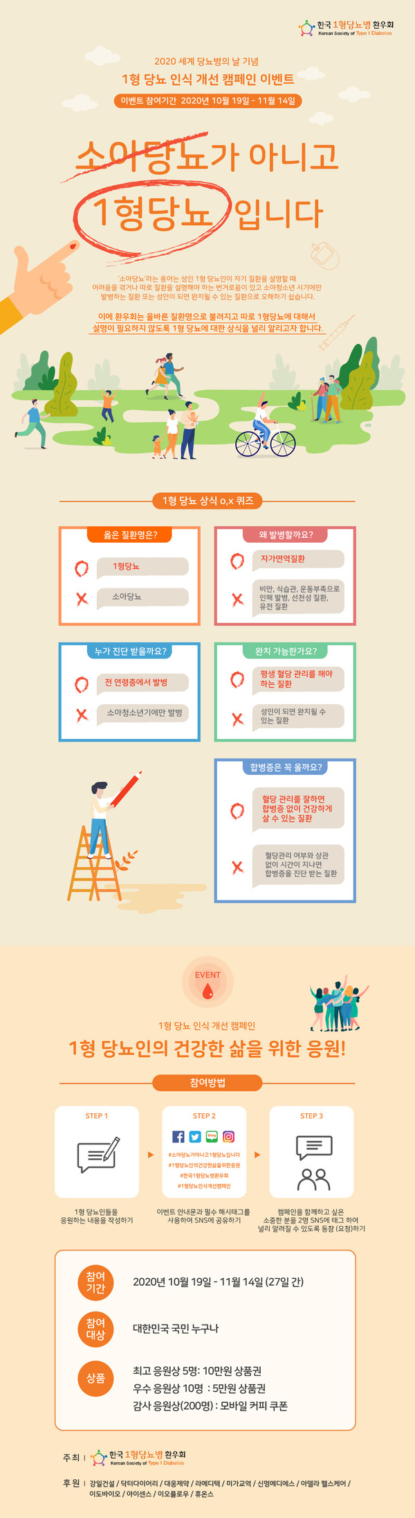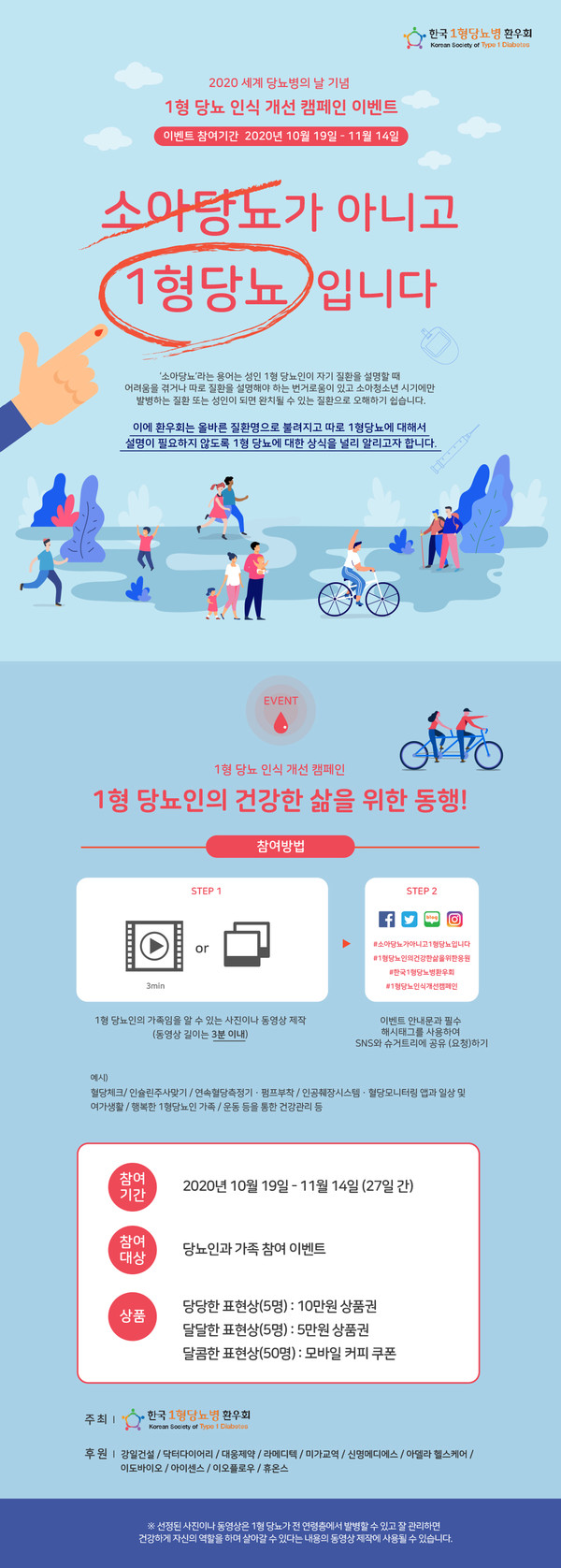 올해는 '소아당뇨가 아니고 1형당뇨입니다'라는 인식개선 슬로건으로 진행된다. 제1형 당뇨병은 우리 몸의 췌장(이자)에서 인슐린을 분비하지 못해 발생하는 질환이다. 이번 캠페인은 당뇨관련 업체 10곳(닥터다이어리, 대웅제약, 라메디텍, 미가교역, 신명메디에스, 아델라 헬스케어, 이도바이오, 아이센스, 이오플로우, 휴온스)이 함께 한다.