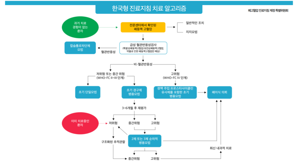 이처럼 폐동맥 고혈압은 ▷건강보험 적용기준이 중증도에 맞춰져 있고 ▷조기에 적극적인 병용이 어려우며 ▷그동안 표준진료지침이 없어 치료 환경이 매우 나쁜 질환 중 하나였습니다. 이러한 문제를 해결하고자 최근 국내 의료실정에 맞는 '한국형 폐동맥 고혈압 진료지침'이 제정됐습니다. 한국형 폐동맥 고혈압 진료지침은 ▷단순한 위험도 평가 기준 ▷국제 치료법을 국내 보험체계에 반영된 내용을 담고 있습니다.