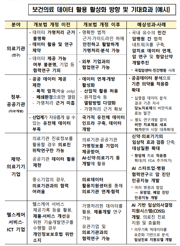 의료기관은 다양한 기관과의 협업을 통한 가명 정보 결합, 분석이 가능하게 돼 빅데이터에 근거한 안전하고 정확한 진단‧검사, 치료법 개발 등 의료 질 향상에 기여할 수 있고, 산업계에서는 결합정보를 바탕으로 제품‧서비스 수요 발굴 및 모형(모델) 검증, 임상효과 확인 등이 가능하게 되어, 신약, 융합형 의료기기, 유망 서비스 개발이 가속화될 것으로 보인다.