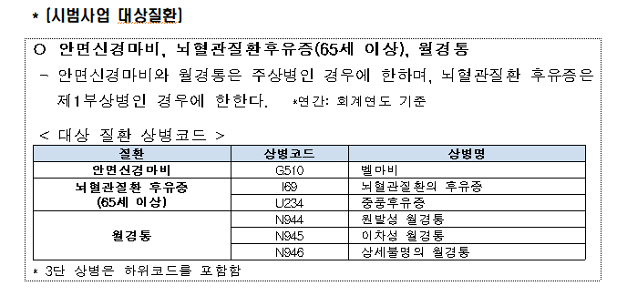시범사업 대상 3개 질환은 ▲안면신경마비 ▲뇌혈관질환후유증(65세 이상) ▲월경통으로, 해당질환의 환자는 시범사업 참여 한의원을 방문해 진찰·처방 후 치료용 첩약을 시범 수가로 복용할 수 있다.