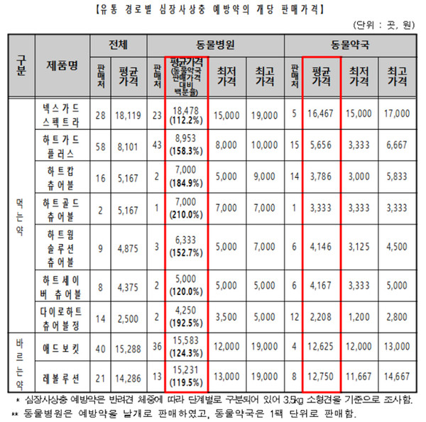 먹는 심장사상충 예방약 7종은 동물병원의 개당 평균 판매가격이 동물약국보다 최소 12.2%에서 최대 110% 비쌌다. 바르는 심장사상충 예방약 2종은 동물병원의 개당 평균 판매가격이 동물약국보다 각각 19.5%, 24.3% 더 비싼 것으로 조사됐다.