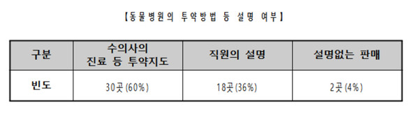 수의사가 직접 진료를 통해 투약지도한 병원은 30곳(60%), 직원이 설명한 병원은 18곳(36%)이었고, 나머지 2곳(4%)은 아무런 설명 없이 약을 판매하고 있었다.