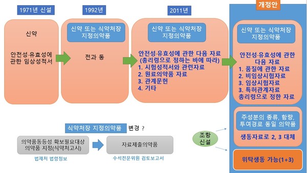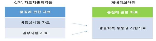 검토보고서의 내용을 개정안에 대입(식약처장 지정의약품 → 자료제출의약품)하면 개정안은 신약 또는 자료제출의약품, 즉 선발품목의 허가신청자료는 품질, 비임상, 임상 자료 등이고, 제네릭은 선발품목의 ‘비임상, 임상 자료’를 대체하여 생물학적 동등성시험 자료 등을 제출하여야 한다.