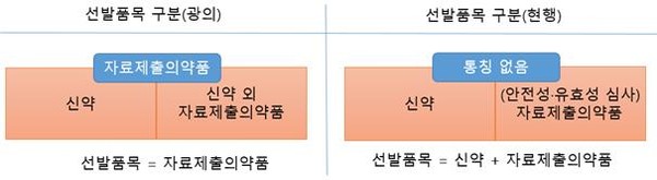 현행 품목허가고시에서 자료제출의약품을 ‘신약이 아닌 의약품이면서 안전성·유효성 심사가 필요한 품목’으로 정의하고 있음에 따라 개정안이 ‘신약 및 자료제출의약품’으로 선발품목을 구분하였으나 넓은 의미에서는 신약도 자료제출의약품에 해당된다.